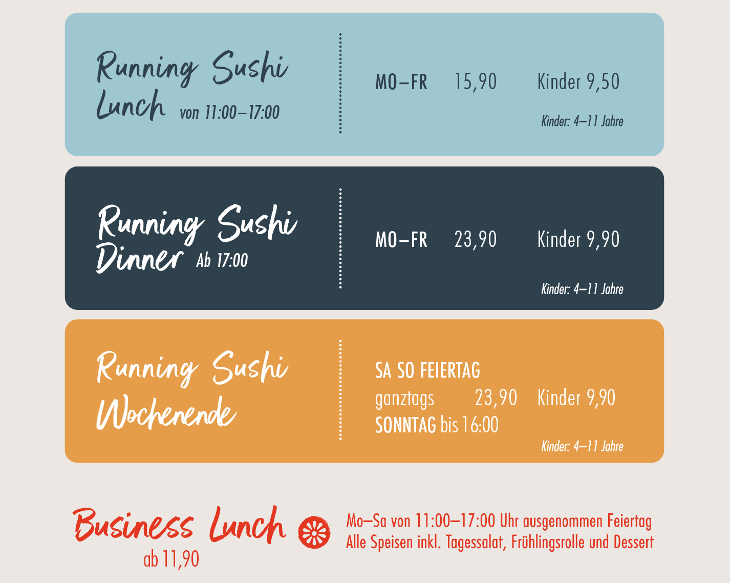 Wählen Sie aus über 50 kalten Sushi, Maki, Vor-, und Nach- speisen von unserem Running-Sushi-Band und gleichzeitig via Computer-Tablet aus über 40 warmen „á La Carte“ Speisen, welche wir Ihnen frisch zubereitet servieren.